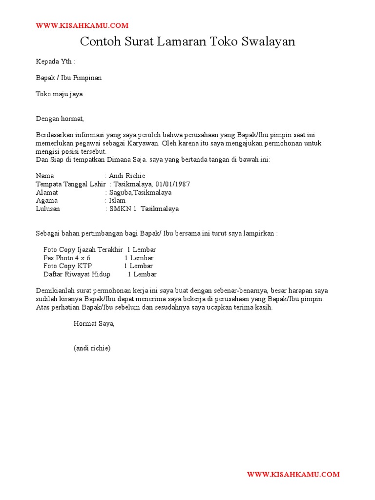 Contoh Surat Lamaran Kerja Di Toko Swalayan Kumpulan Contoh Gambar from gudviral.com Berbicara mengenai tugas karyawan toko memang bisa dibilang gampang gampang susah pasalnya selain harus bisa membentuk kepercayaan pelanggan. Semoga contoh lamaran pekerjaan karyawan toko ini dpt menolong anda dalam menulis surat lamaran kerja itu. Contoh surat lamaran kerja menjadi karyawan toko den. Pengetahuan menyangkut format atau bentuk surat lamaran kerja untuk suatu lowongan pekerjaan tertentu seringkali dianggap mudah, namun tidak jarang justru gagal. Inilah pembahasan lengkap terkait toko swalayan contoh surat lamaran kerja di swalayan. Contoh surat lamaran kerja di swalayan toserba kasir lulusan smk sederajat berikut ini adalah contoh tentang contoh surat lamaran kerja di. Baik mereka yang baru lulus kuliah s1 atapun mereka yang lulus sma atau. Jika ada sedang mencari contoh surat lamaran kerja di swalayan.
